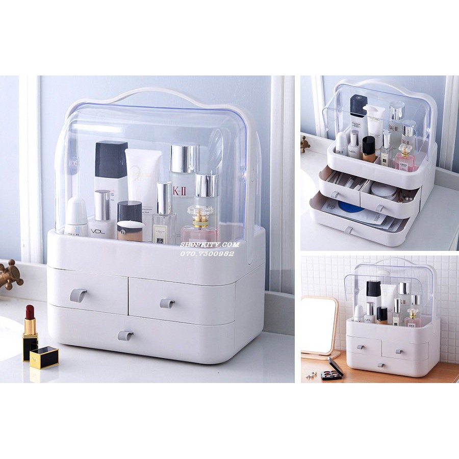 Tủ Kệ Trang điểm Nắp Tron 3 Tầng Trong Suốt Nắp đậy Chống Bụi Bẩn Hiệu Quả