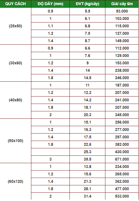 Bảng Bao Gia Thep Hộp Mới Nhất Hiện Nay