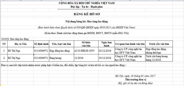 Bảng Ke Hồ Sơ Theo Quyết định 959 Bhxhvn