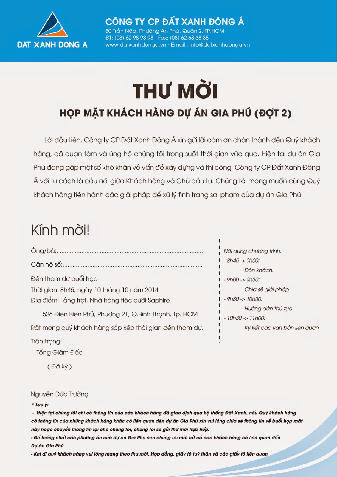 Khach Hang Gia Phu Land Thư Mời Họp Mặt Khach Hang Gia Phu đất Xanh Tổ Chức
