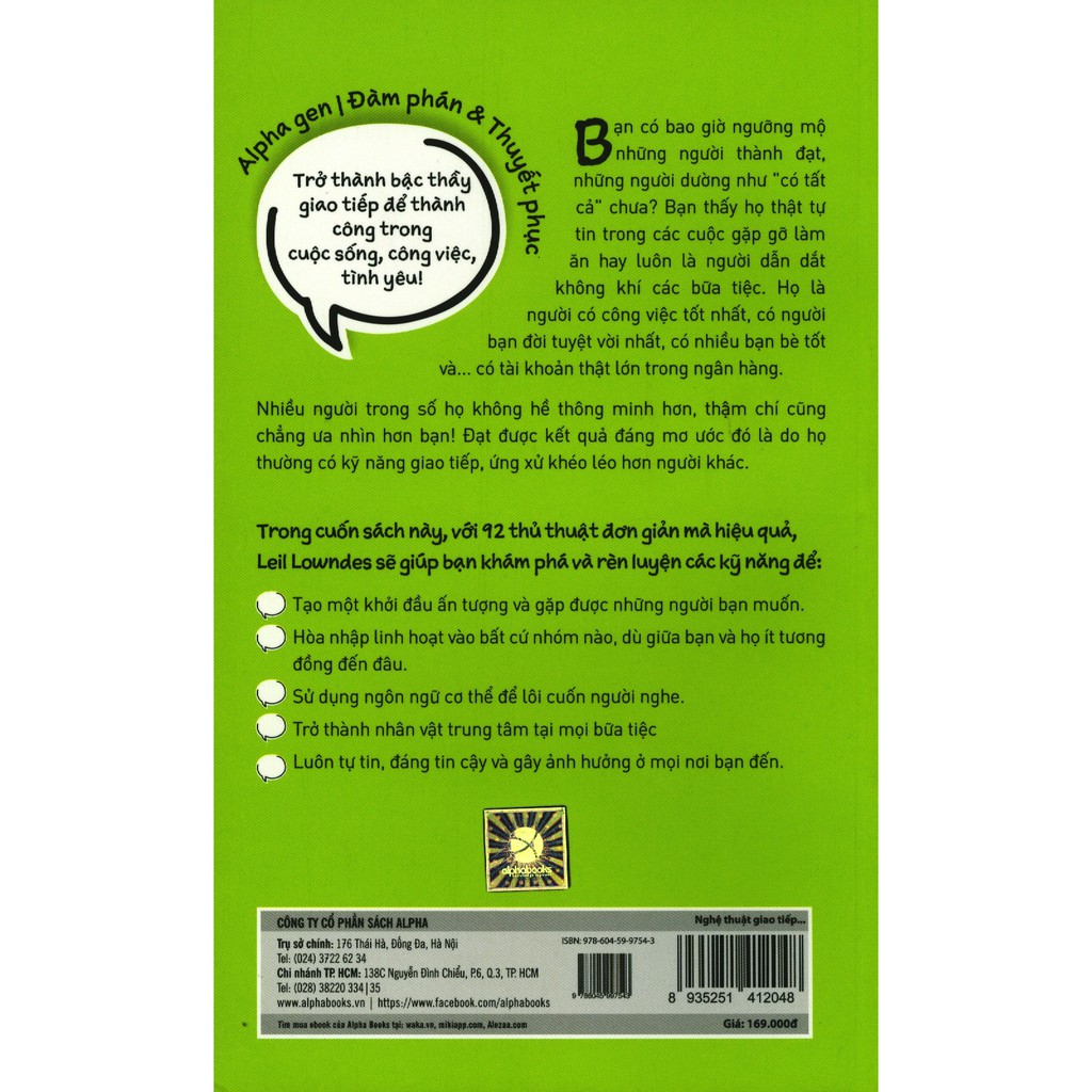 Chúng ta không thể đơn thương độc mã trên hành trình đến thành công. Nghệ thuật giao tiếp để thành công là cuon sách hướng tới mọi đoi tượng độc giả dù là sinh viên hay nhân viên bán hàng doanh nhân nhà quản lý chính trị gia hay người nội trợ hoặc bất cứ ai muon kiểm soát các moi quan hệ thu nhập hay cuộc đời họ theo cách hiệu quả hơn. Nghệ thuật giao tiếp để thành công leil lowndes trở thành bậc thầy giao tiếp để thành công trong cuộc sống công việc tình yêu. Nghệ thuật giao tiếp để thành công các nghiên cứu cho thấy 85 thành công trong cuộc sống của chúng ta có liên quan trực tiếp đến kỹ năng giao tiếp.